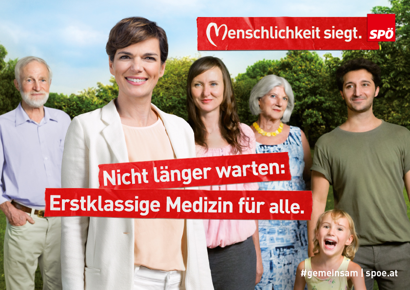 „Nicht länger warten: Erstklassige Medizin für alle.“ zeigt auch eine Menschengruppe im montierten Grün. Die Frau und der Mann im grünen Shirt sind die gleichen wie am vorigen Plakat. Die beiden älteren Personen zeigen unglaubwürdige Mimik. Vor allem die ältere Dame wirkt skeptisch: Ihr Kopf ist leicht geneigt, die Lippen leicht nach hinten gezogen und ihr Blick geht zum Betrachter. Der älterer Mann blickt in Rendi-Wagners Rückseite, er blickt starr und ernst. Einzig das kleine Mädchen freut sich. Doch was haben Bild und Text miteinander zu tun? Die Botschaften ergänzen oder erklären einander nicht.