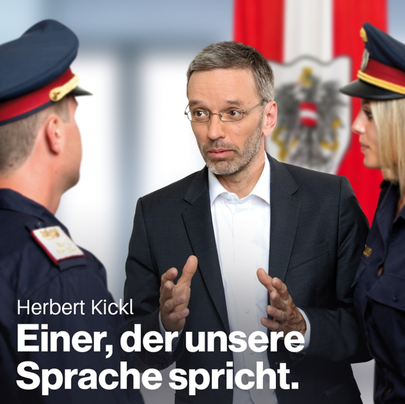 „Einer, der unsere Sprache spricht.“ zeigt einen Herbert Kickl, der seine Hände so hält, als würde er etwas besonderem Ausdruck verleihen wollen, er das Verstehen vom Gegenüber einfordert und die Dringlichkeit betont. „Unsere“ ist nicht die Gesellschaft, sondern die Polizei. Kickl steht für Kontrolle und dafür, dass er mit der Fahne im Rücken Gesetze durchsetzen kann.