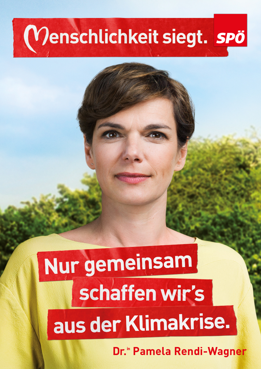 „Nur gemeinsam schaffen wir es aus der Klimakrise.“ zeigt Pamela Rendi-Wagner mit einer Gruppe an Personen vor einem natürlichen Hintergrund – jedoch sieht man deutlich, dass sie vor einer Kulisse stehen. Das Szenario ist also nicht echt, es ist künstlich. Auch bei Mimik und Körperhaltung sieht man viele subtile (falsche) Botschaften. Die Frau rechts neben ihr hat eine leicht abgewandte Körperhaltung. Auch Rendi-Wagners Oberkörper ist leicht nach hinten gebeugt. Ihre Hände sind nach oben offen, sie versucht etwas zu erklären. Ihre Mundwinkel nach hinten zeigen leichte Unsicherheit und auch den Nachdruck, dass sie will, dass ihr Gegenüber sie versteht. Das Gegenüber aber zeigt einen eher skeptischen Blick. Auch der Mann rechts hinten mit dem grünen Shirt wirkt eher skeptisch als zugewandt. Und auch der Mann mit dem blauen Shirt – er hat seine Oberlippe leicht nach oben gezogen – er zweifelt. Einzig die Frau mit dem „Planet B“ T-Shirt zeigt Zugewandtheit, wirkt aber sehr gestellt. Rendi-Wagner versucht die Personen zu überzeugen, aber es gelingt ihr nicht. Sie wirkt schwach.