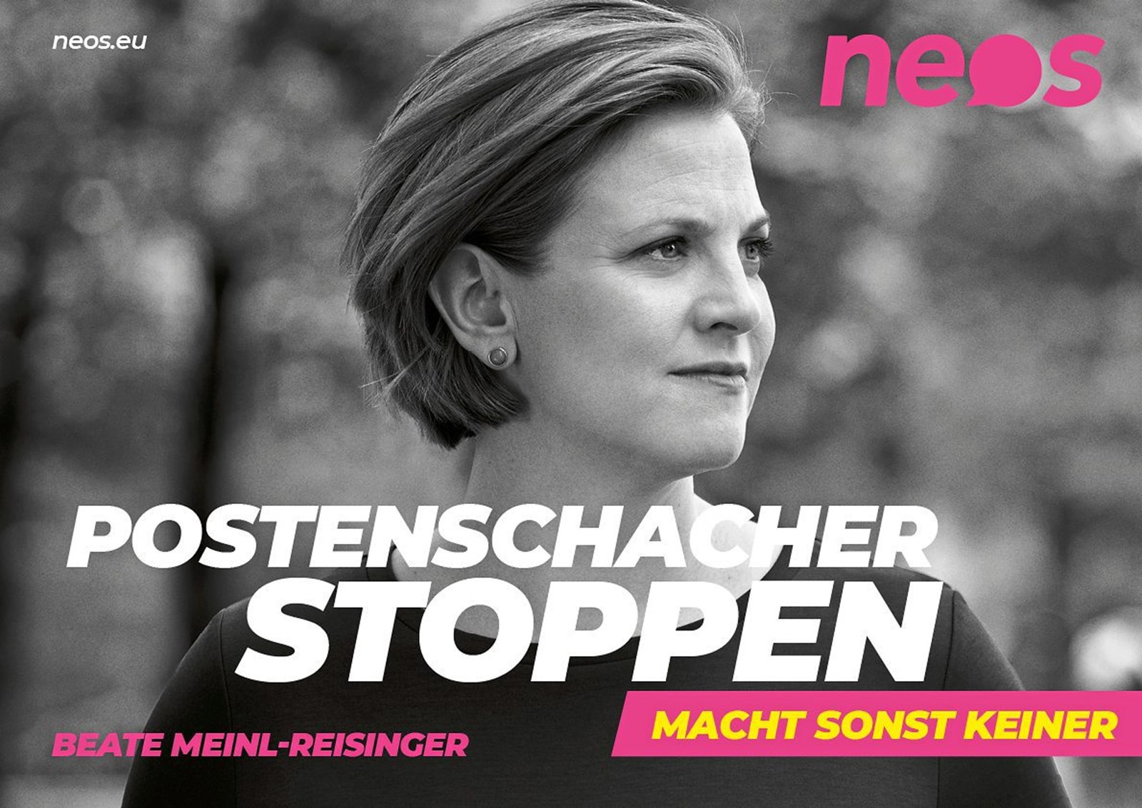 In der ersten Werbewelle der Neos war noch Farbe in den Plakaten, es präsentierte sich nicht nur Beate Meinl-Reisinger. Die langen Textbotschaften erfordern viel Aufmerksamkeit und sind auch inhaltlich fordernd. Die Entschlüsselung wird erschwert durch den entgegengesetzten Lesefluss von rechts oben beim Logo über die Mitte mit der Vertreterin nach links unten zu Text und Absender.