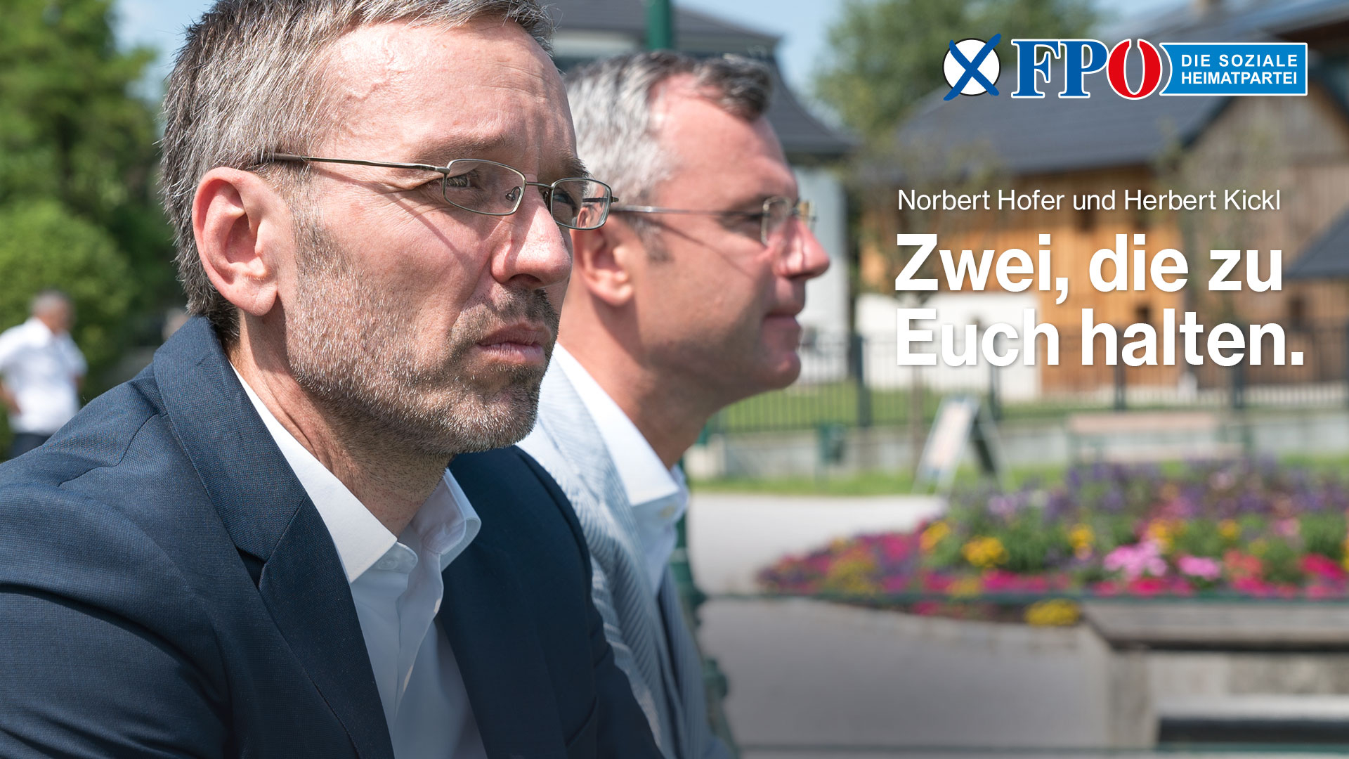 „Zu, die zu Euch halten“. Jene Plakate, wo beide als Duo auftreten und den Zusammenhalt ausdrücken. „Zu euch halten“, „für dich“ sind klare Ansagen, klare Versprechen. Das Motiv: füreinander da sein, sich einsetzen, zusammen mehr erreichen. Stabilität wird vermittelt. Norbert Hofer ist der, der freundlich in die Zukunft blickt, während Herbert Kickl leicht zur Seite blickt. Ernst, fokussiert – er hat wie immer alles im Blick.